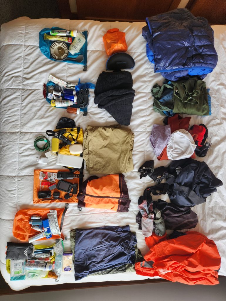 Even with 3 large bags, keeping packing to a minimum was a challenge. Once the extreme wet & cold weather gear, 2 cycle kits, the bike maintenance & tech was packed, there was very little room for much else. One t-shirt, pair of trousers, swimming shorts & a fleece with a pair flipflops strapped to the top! There lots of really cool lightweight kit out there. I particularly like Sea to Summit.
